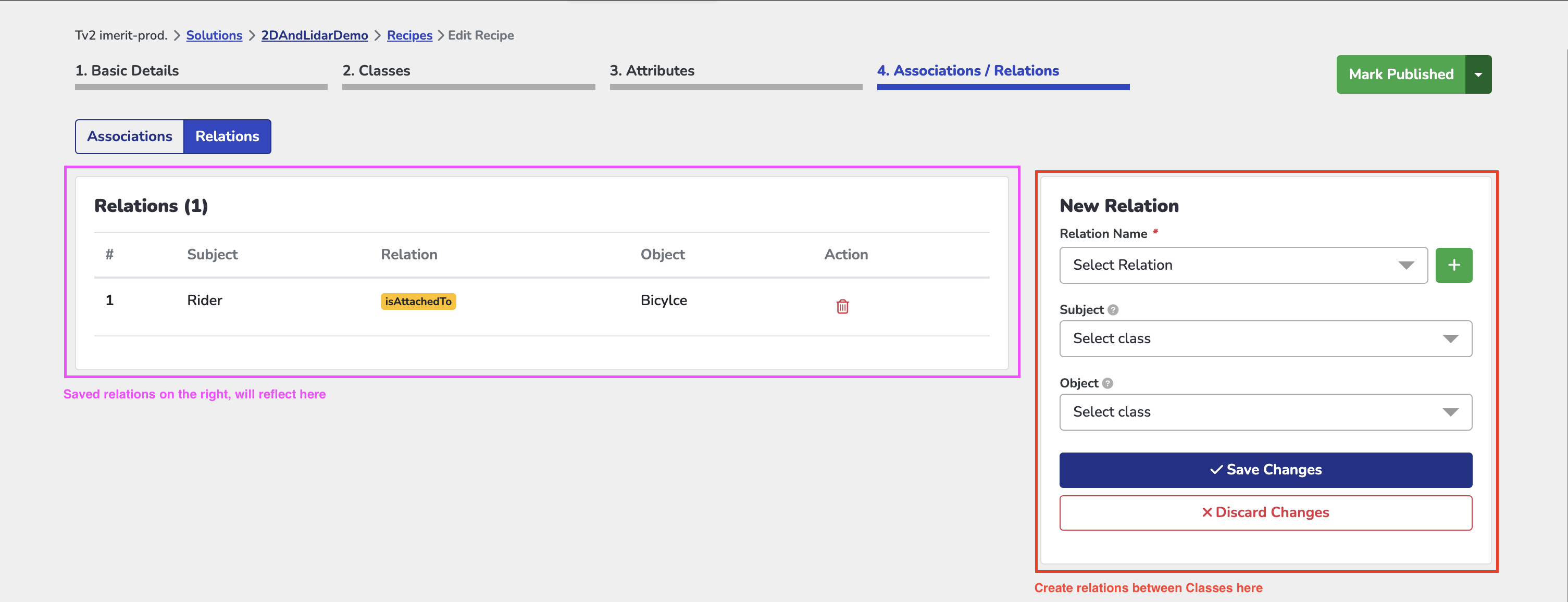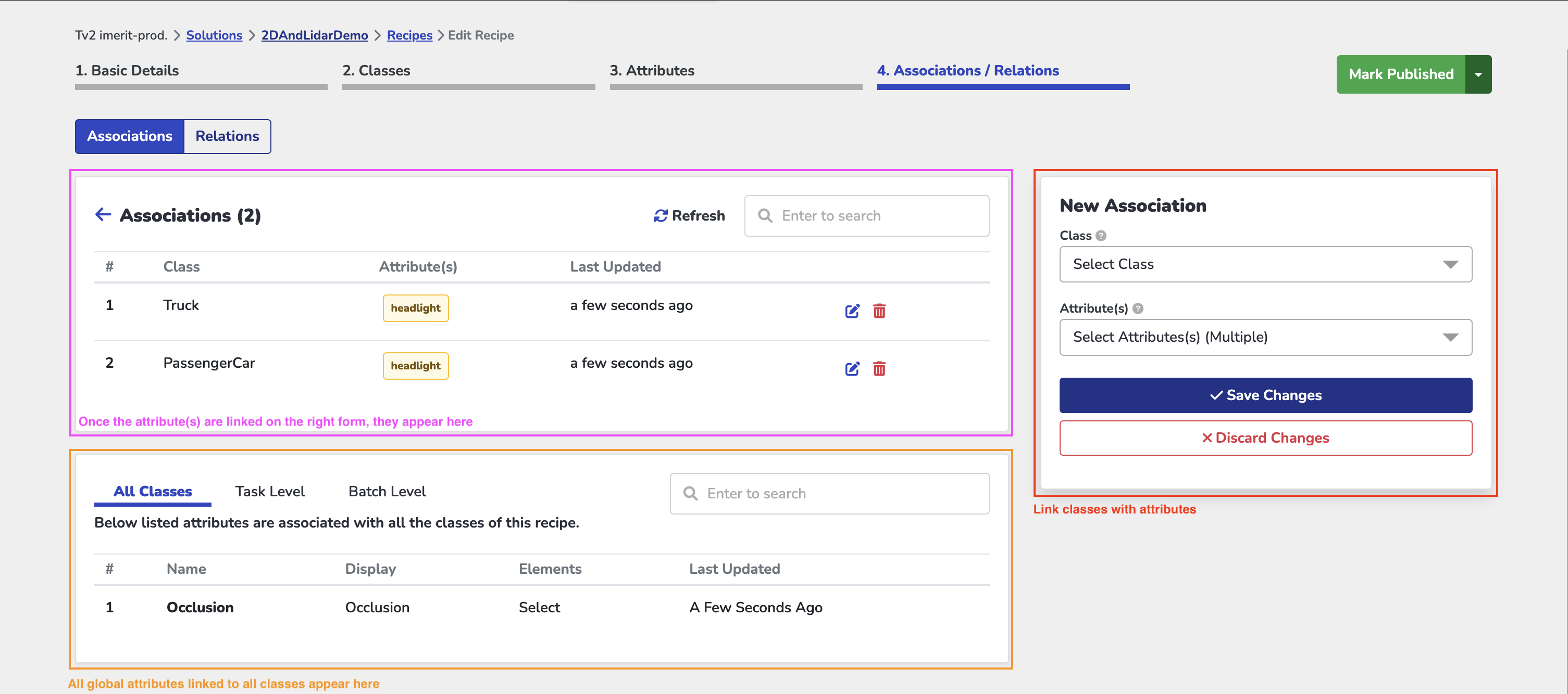 * The *New Association* form on the right side (highlighted area in red) is used to create associations/links between [classes](https://docs.imerit-prod.io/project-setup/create-recipe/2.-classes) and [attributes](https://docs.imerit-prod.io/project-setup/create-recipe/3.-attributes) created in the prior steps.